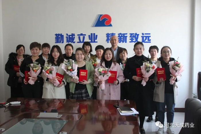3月8日上午,河北天成藥業(yè)開展“風(fēng)華時代女性,共建美麗天成“三●八"紅旗手頒獎活動。公司黨總.支副書記、工會主席王頤為接受表彰的17位先進(jìn)個人頒發(fā)“三●八"紅旗手證書、鮮花和獎品。
